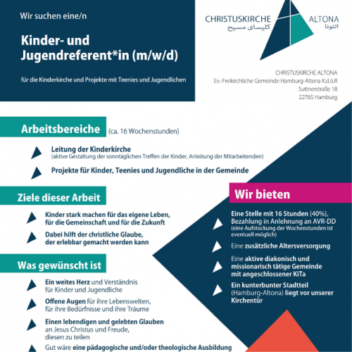Wir werden ab sofort auch Stellenanzeigen von unseren Gemeinden unseres Landesverbandes hier veröffentlichen. Wenn ihr eine Stelle ausgeschrieben habt, schickt sie uns gern mit allen Informationen zu. Unter dem neuen Menüpunkt „Jobs“ findet ihr die erste Stellenanzeige.